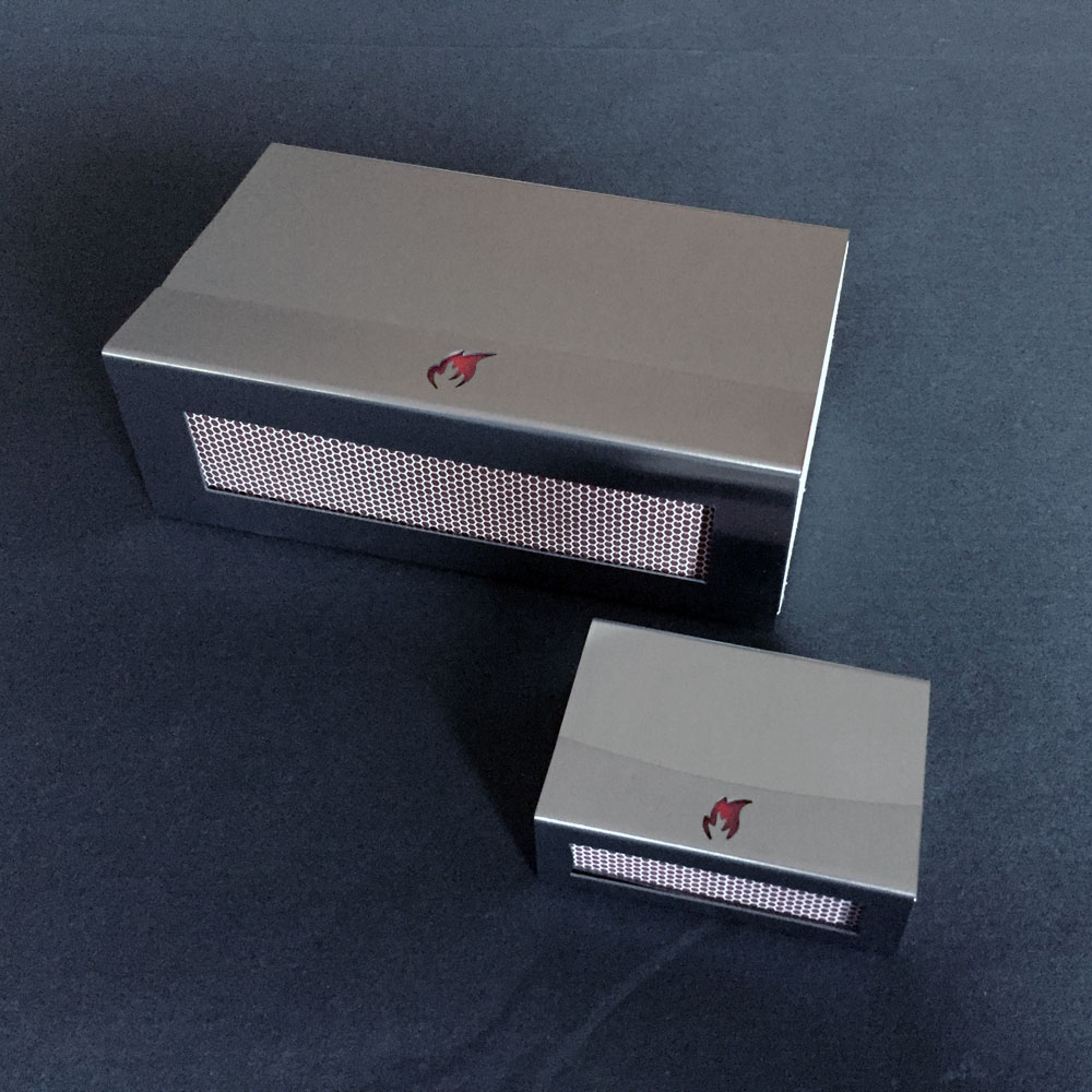 Die größte bisherige Hülle haben wir für einen US-Kunden gefertigt und ist mit gut 3,5 cm vor allem sehr dick. Daneben sieht die kleine Hülle im Standardformat wie für eine Puppenstube aus: