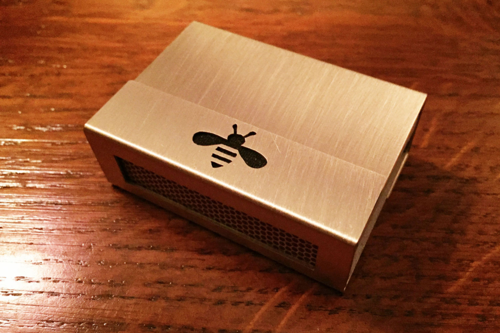 Diese Hülle trägt eine stilisierte Honigbiene – von Hand in Messing ausgesägt.