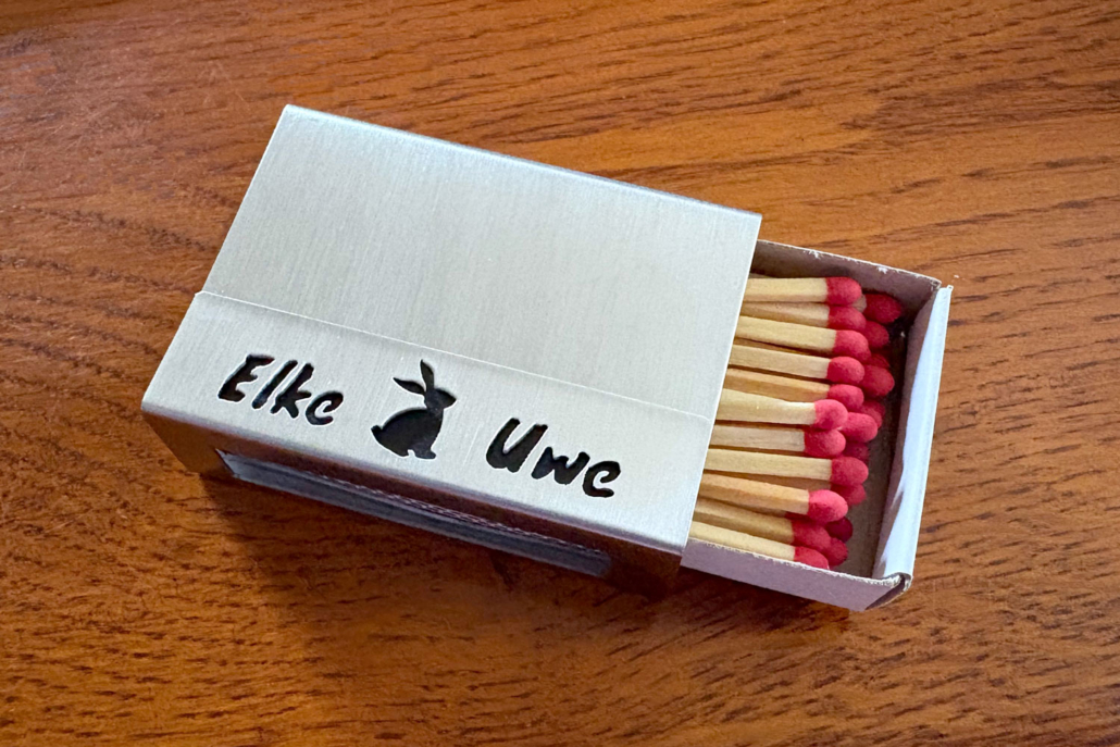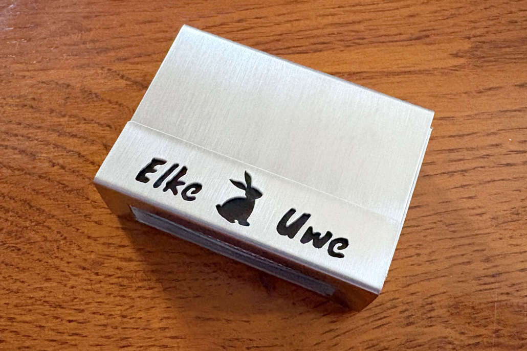 Für diese Hülle wurden die Namen Elke und Uwe von Hand in Edelstahl ausgesägt und durch die Silhouette eines Hasen ergänzt.